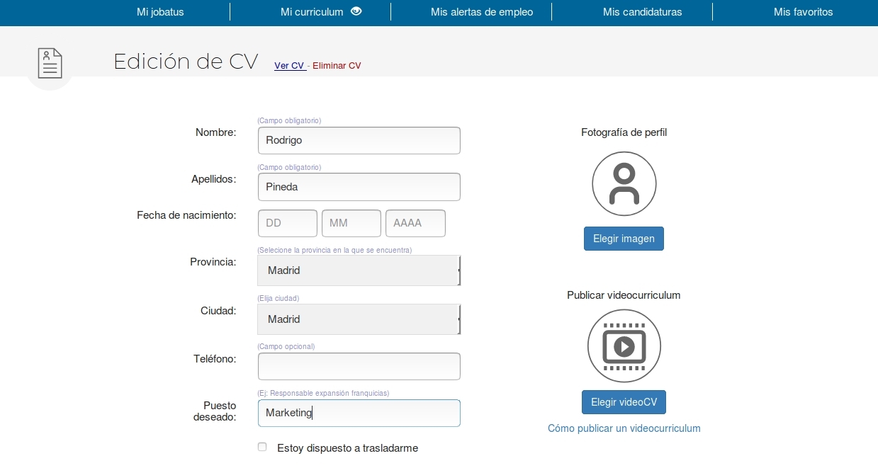 - Una volta entrato nel tuo pannello, fai clic sulla scheda'Il mio curriculum'", y, una vez dentro, clica en el botón "elegir videocurrículum" dentro del primer apartado.